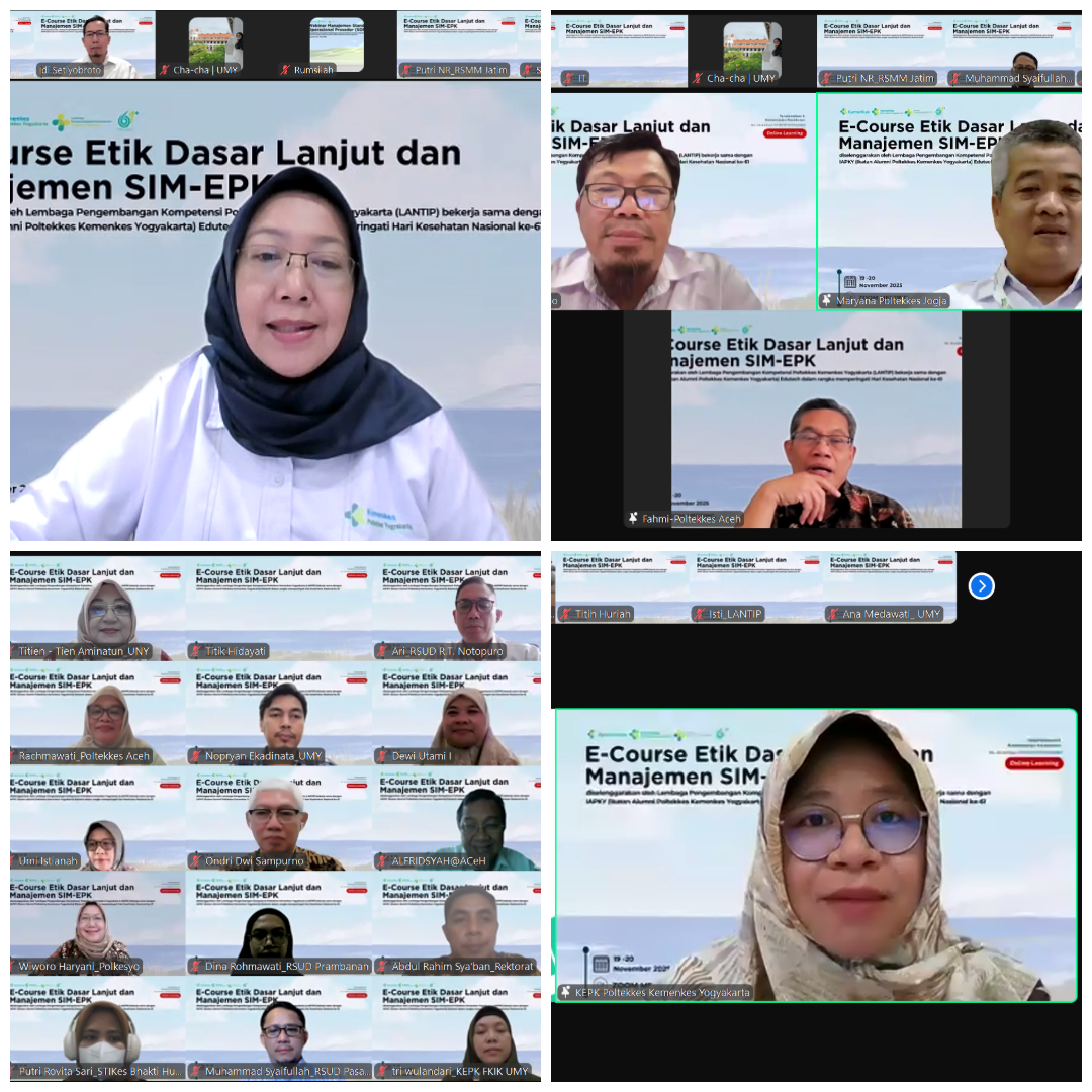 Yogyakarta, 19–20 November 2025 — Lembaga Pengembangan Kompetensi Poltekkes Kemenkes Yogyakarta (LANTIP) bekerja sama dengan IAPKY menyelenggarakan E-Course Etik Dasar Lanjut dan Manajemen SIM-EPK secara hybrid. Kegiatan ini diikuti 116 peserta dari 30 institusi, antara lain IPB University, Universitas Muhammadiyah Yogyakarta, Universitas Sultan Ageng Tirtayasa, UIN Jakarta, Universitas Islam Sumatera Utara, Politeknik Kesehatan Kemenkes Yogyakarta, Politeknik Kesehatan Kemenkes Aceh, RSUD Mohammad Noer Pamekasan, RS Mata Masyarakat Jawa Timur, RSJ Grhasia dan lainnya.