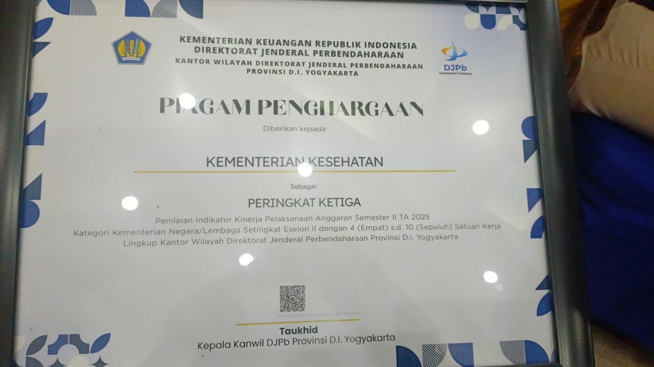 Poltekkes Kemenkes Yogyakarta berhasil meraih penghargaan peringkat 3 atas penilaian dengan Kinerja Pelaksanaan Anggaran Terbaik Umum setingkat Esselon II. Wilayah Yogyakarta Yang membawahi wilayah mewakili kementerian kesehatan.